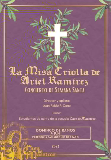 Su primer concierto se dio en el marco de la Semana Santa del mismo año y fue una reducción de La Misa Criolla del maestro Ariel Ramírez – gran compositor argentino – para los primeros estudiantes de canto de la escuela; algunos maestros les acompañaron en la ejecución del piano, el charango, la guitarra y el bombo legüero y fue dirigido por el maestro fundador de la escuela, Juan Pablo Cano, quien también interpretó la voz solista.